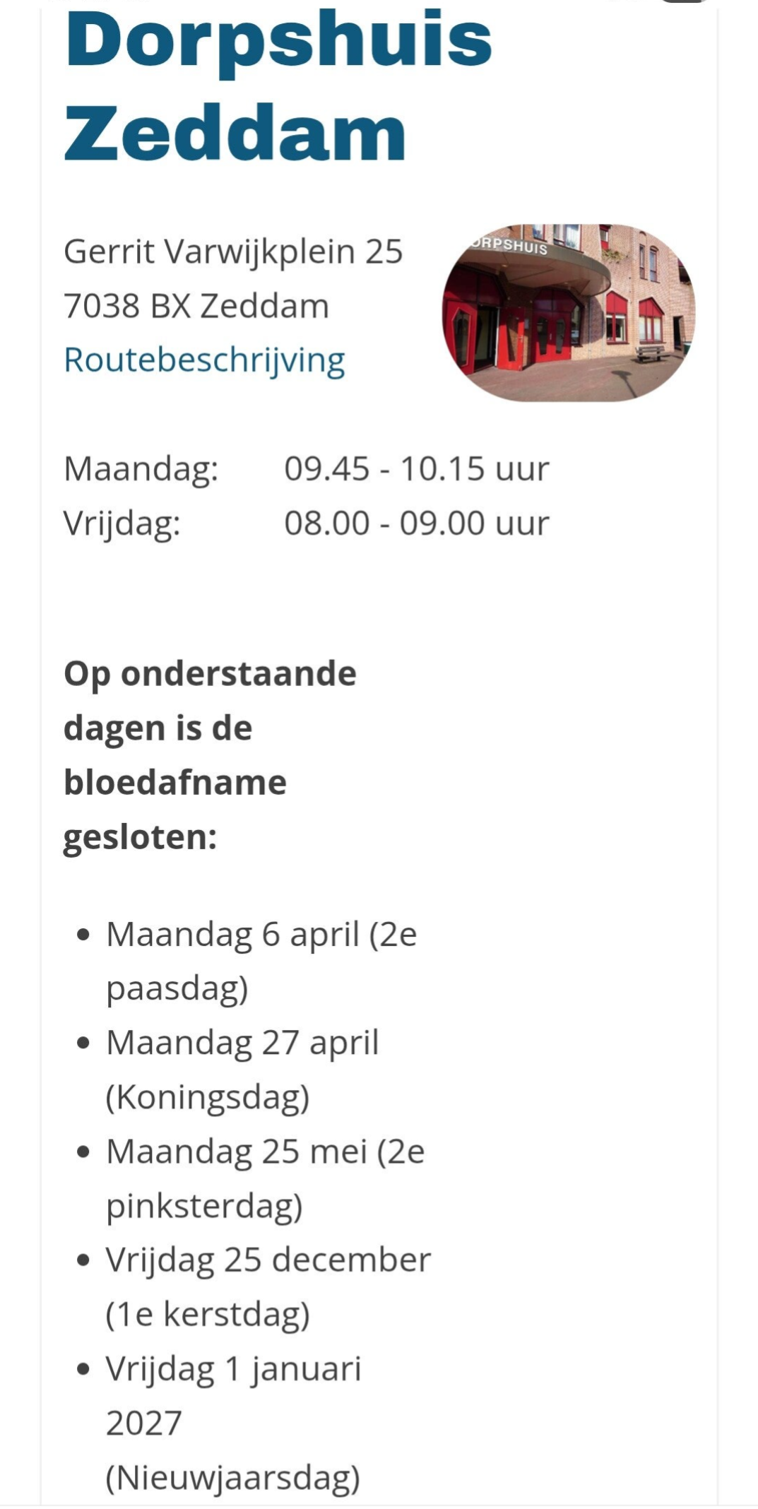 Wanneer u bent doorverwezen door uw arts voor bloedafname dan kunt u daarvoor terecht bij de afnamepunten (prikposten) in de regio. Dorpshuis Zeddam is zo'n afnamepunt.